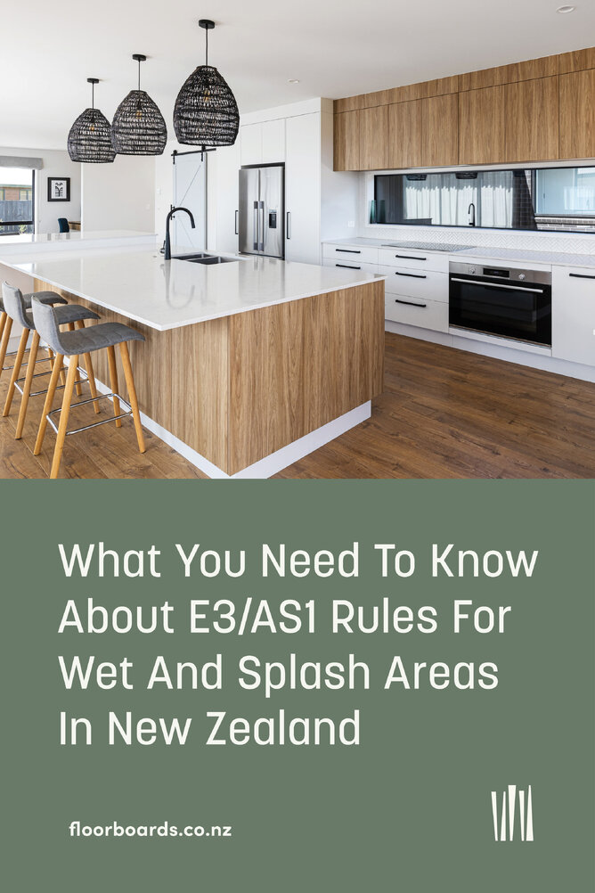 For most homes, that will mean having a splash-resistant flooring in the entire bathroom, or in the kitchen and extending 1.5 metres from the taps, dishwasher, plumbed fridge, etc.