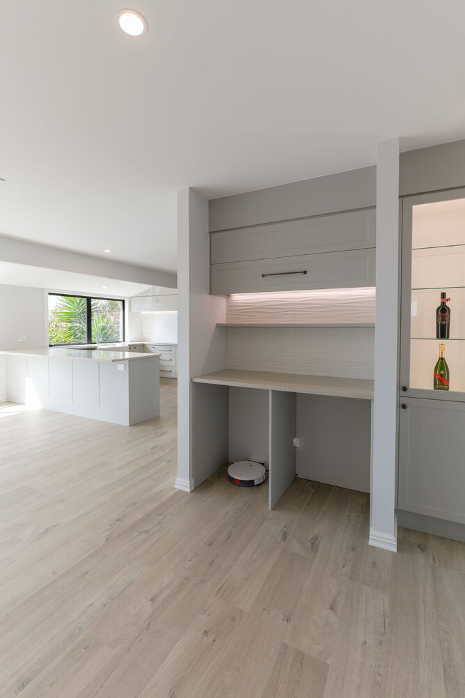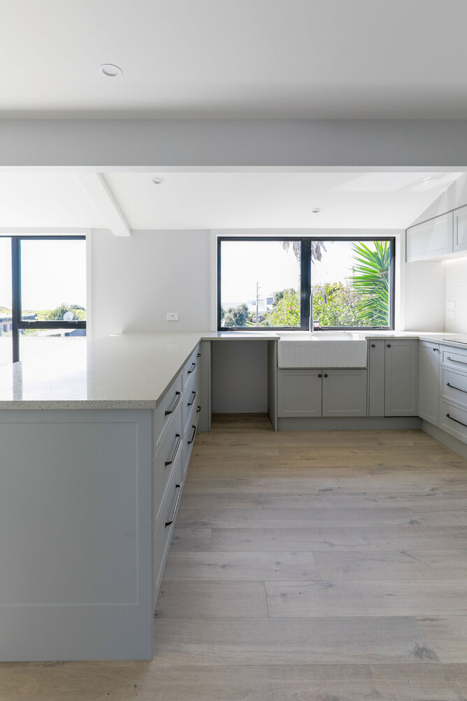 Straight Up Builders has masterfully transformed an old 1970s home into a stunning contemporary batch at Papamoa Beach. Our Tauranga Floorboards team is proud to have supplied and installed the laminate flooring that complements this modern makeover.