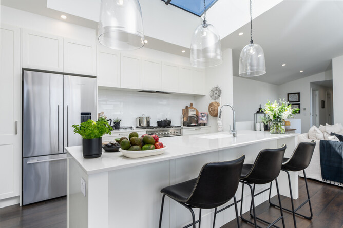 Dark flooring offers a rich, warm base that highlights the room's brighter elements, resulting in a balanced and inviting atmosphere. The use of dark laminate is not only stylish but also practical, offering durability and ease of maintenance.