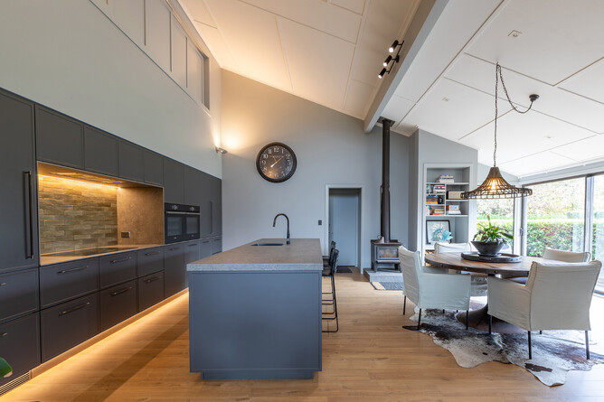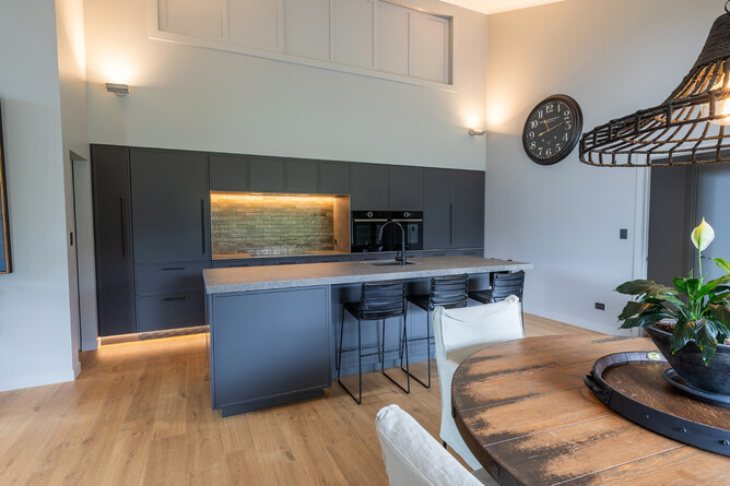 The bulkhead on the backwall where the tall cabinetry sits was originally designed by the Architect as part of the build. The integrated look is further emphasised by the negative detail and sleek cabinetry.