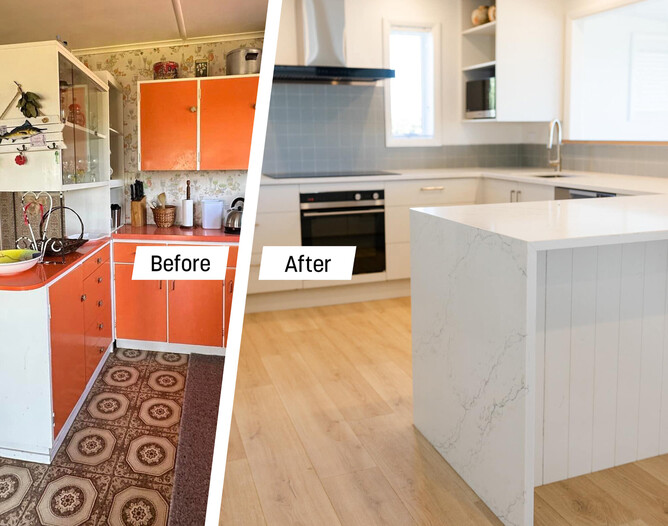Installing the new kitchen and laminate flooring, everything changes. The room instantly feels rejuvenated, with sleek, modern, and durable floors that mimic the beauty of natural wood without the high maintenance.
