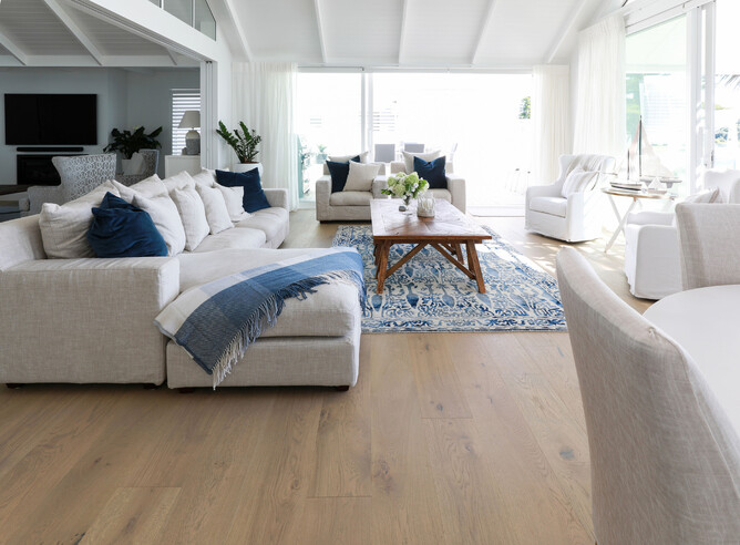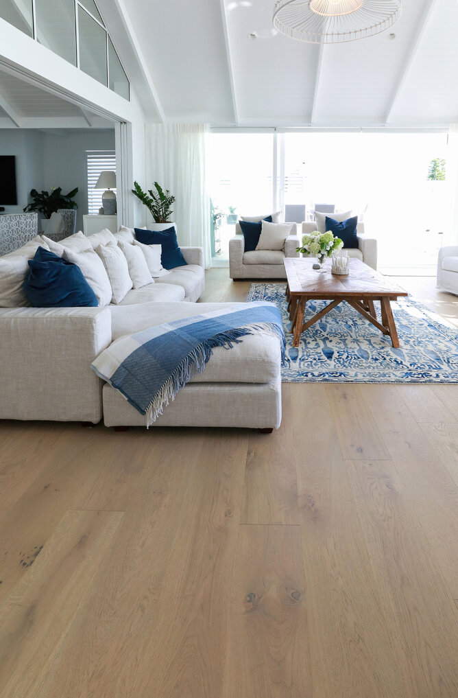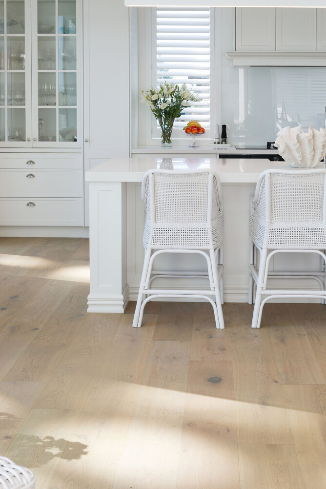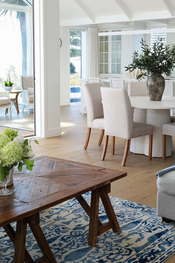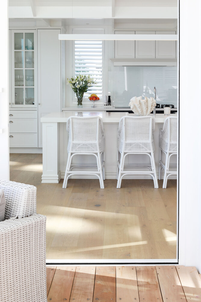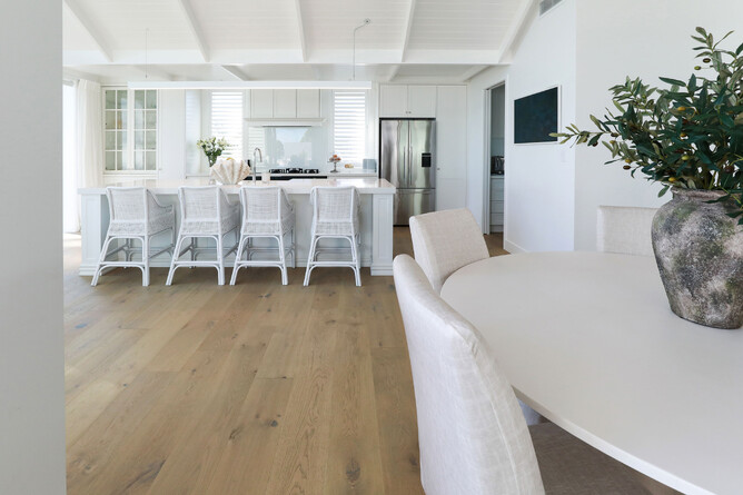 The home's painted structural elements are exposed, creating an airy, summery interior that invites relaxation and comfort. Floorboards European Oak Timber Flooring adds warmth and elegance throughout the home, complementing the beach aesthetic while offering durability for bustling family gatherings.