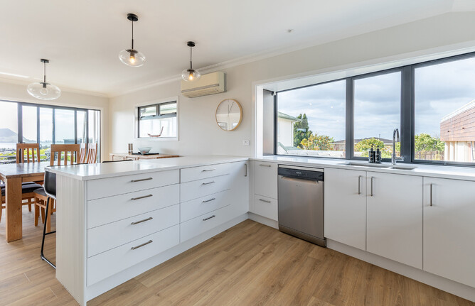After finding their perfect home in Otūmoetai with expansive, uninterrupted views of the Tauranga Harbour, Matakana, Mauao and Pilot Bay, the homeowners relocated from Hamilton to enjoy the Tauranga lifestyle and scenic views. Although the location was perfect, the interior of the house felt dated, so they decided to give it a modern makeover.