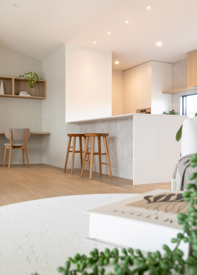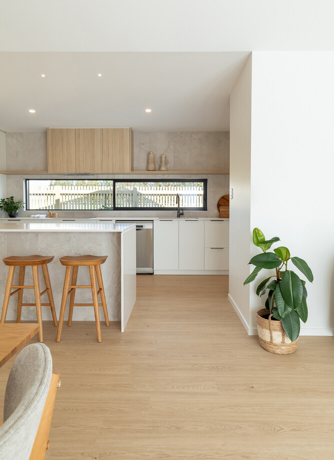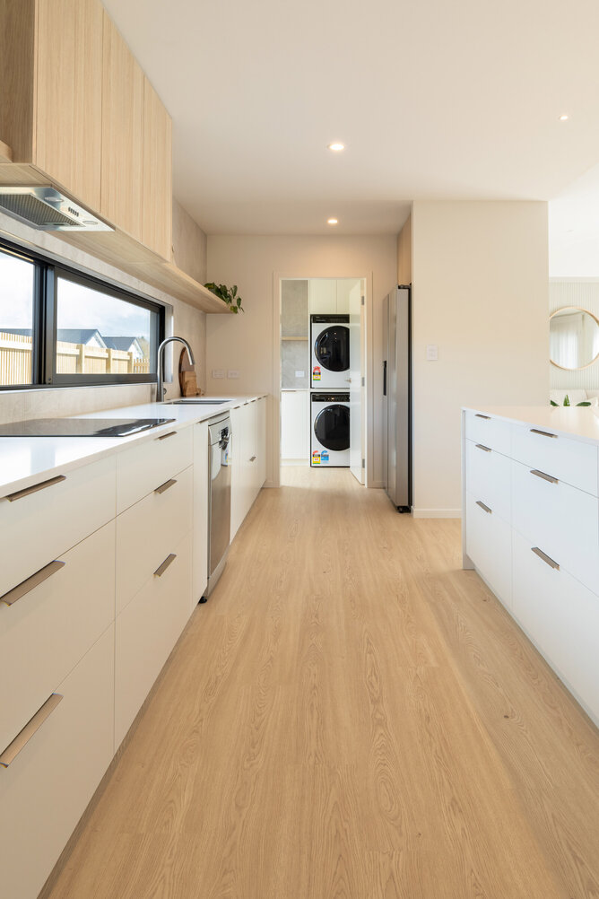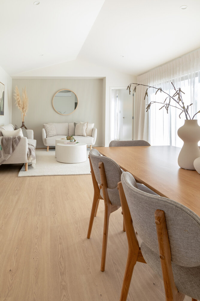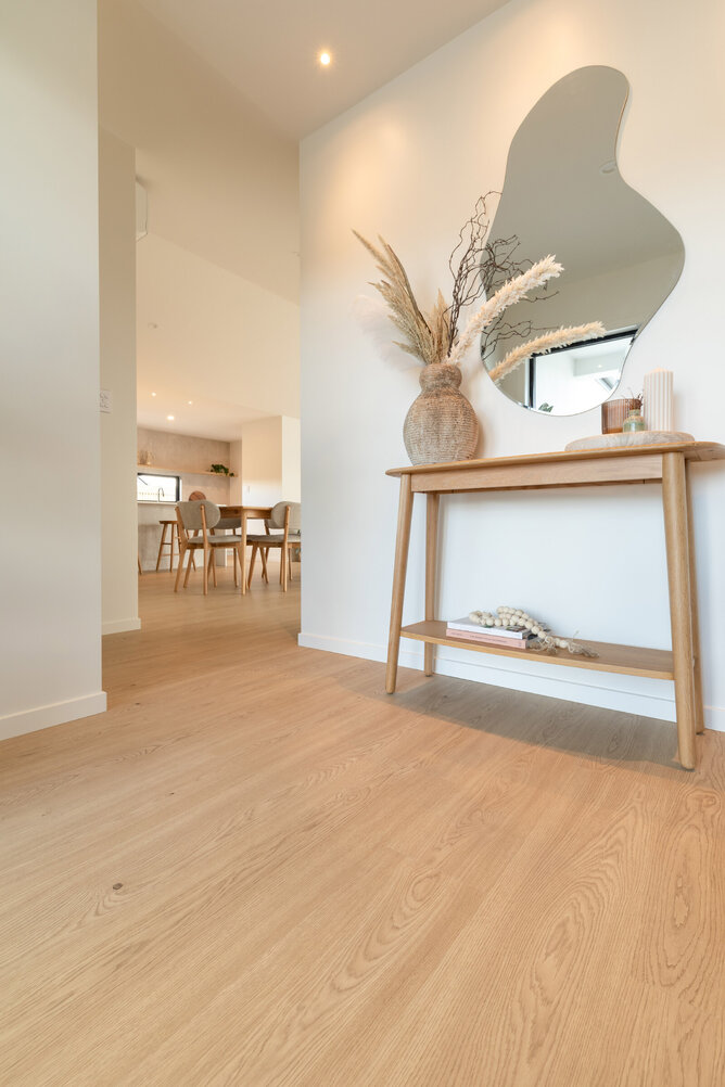 The natural-coloured interior aesthetic of the Fowler Homes Waikato show home is complemented by our Drammen Isla Oak Laminate Flooring. This flooring offers a blend of durability and aesthetic appeal. The realistic wood grain texture and light blonde oak colour add elegance to the space. This laminate floor is visually appealing and easy to maintain, making it an ideal choice for busy households.