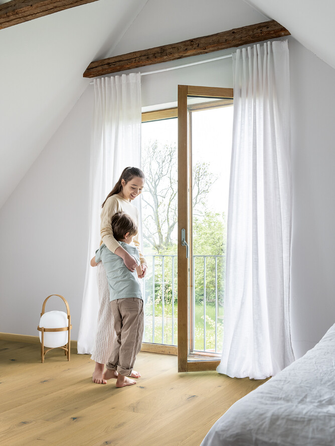 The Harstena collection offers mid-sized planks with a 4-way bevel, giving your home a clean and contemporary look. One of its standout features is the Stayclean+ protection. This innovative technology keeps the surface of your wood floor watertight for up to 72 hours. It also prevents dirt from getting stuck in the joints and wood texture, making the floor easy to clean and helping it maintain its fresh appearance.