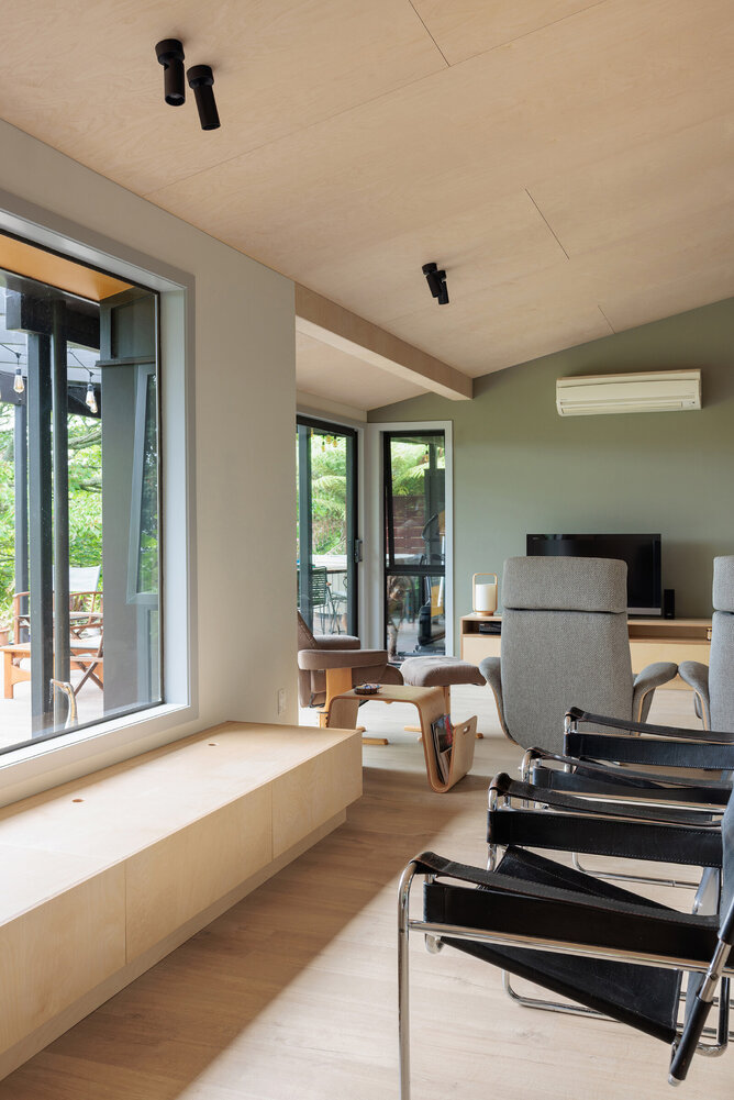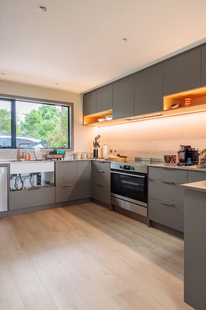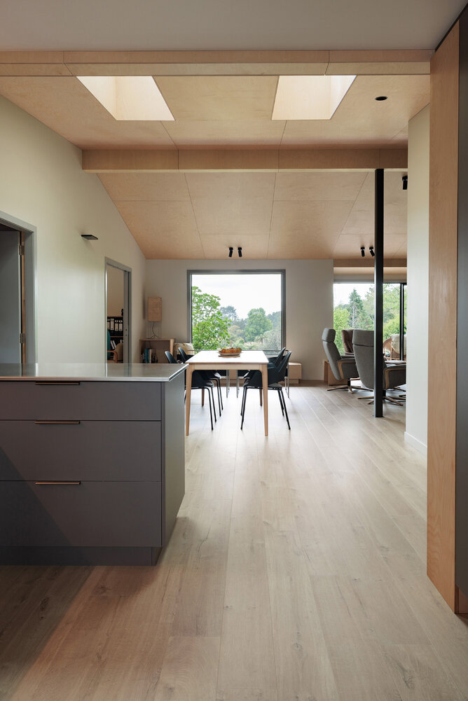 Nestled in the serene rural area of Whakamarama, this renovation project beautifully integrates natural elements with contemporary interior design. The client made thoughtful choices, selecting our Impressive Soft Oak Medium Laminate Flooring for the open-plan lounge, dining, kitchen, and office area. This flooring pairs seamlessly with the beautiful ply ceiling and green feature wall, creating a cohesive and inviting space.