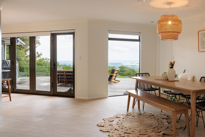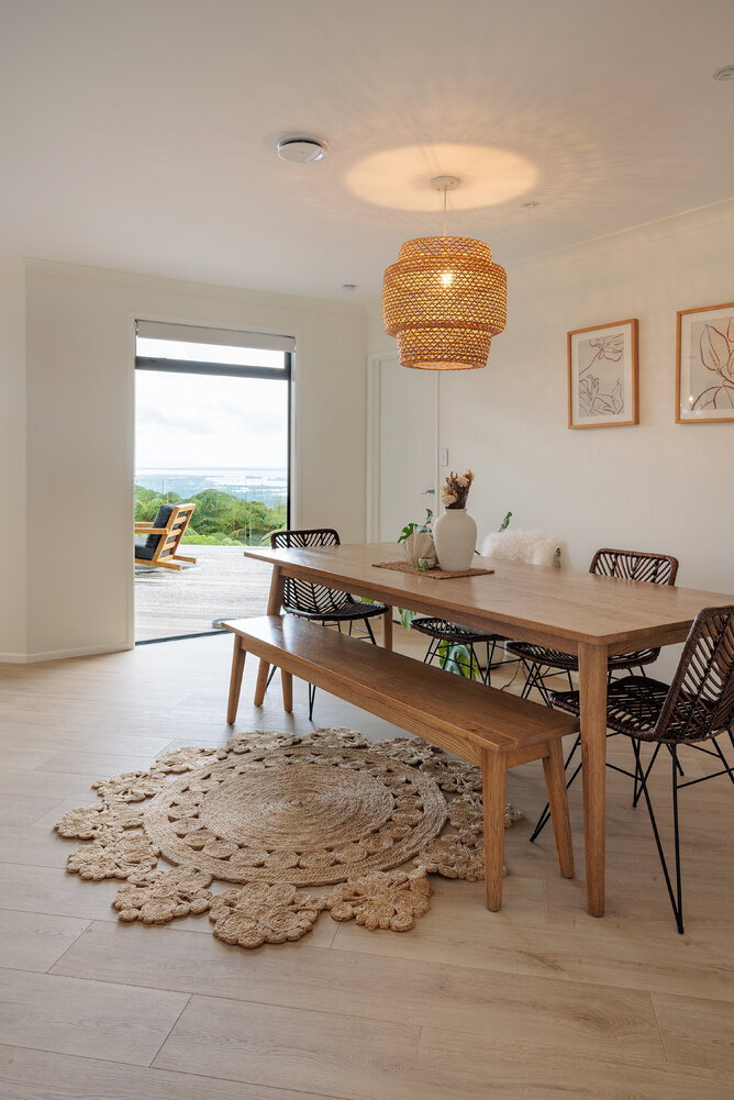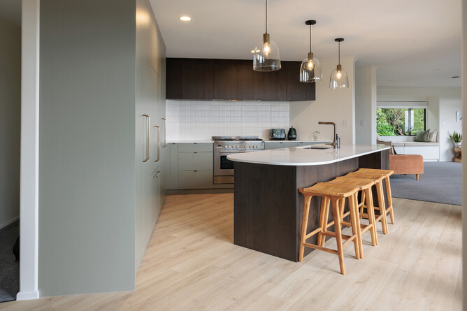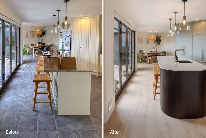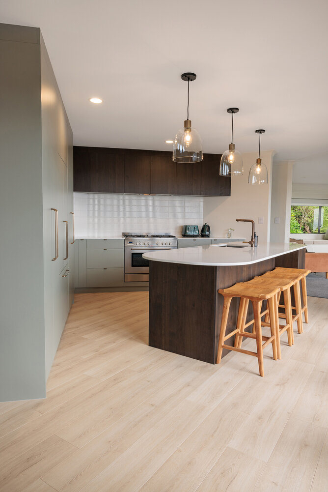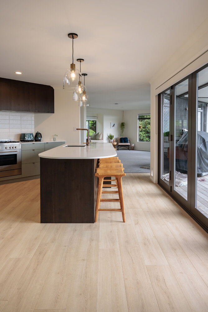 Set amongst native bush and overlooking the picturesque northern end of Tauranga Harbour, the interior of this rural Katikati home has undergone a significant transformation. Our Floorboards installation team installed Quick-Step Perspective Nature Brushed Oak Natural Laminate Flooring in the open-plan dining, kitchen, and entranceway, creating a welcoming and modern look that compliments the home and new kitchen.