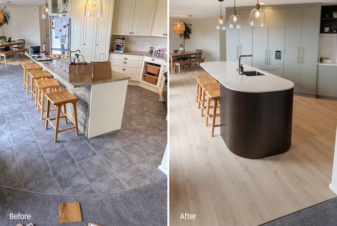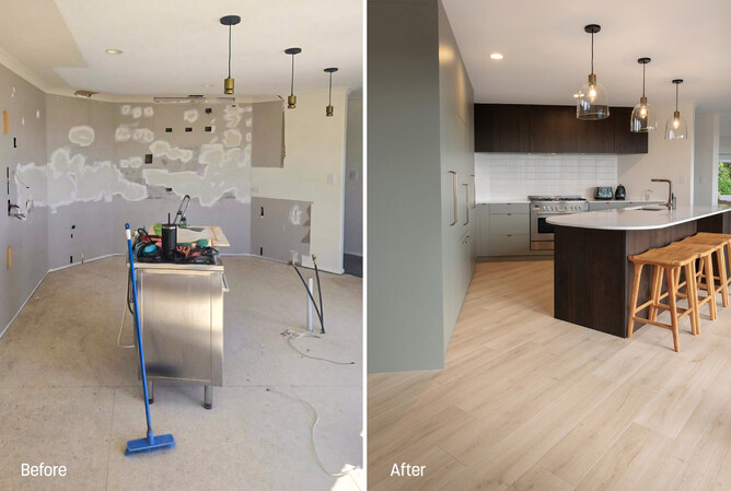 The new kitchen and laminate floor transform the space into a clean, modern home. The quality laminate floor looks stunning as it closely resembles natural timber in both look and feel. Check out some of the before and after images below.